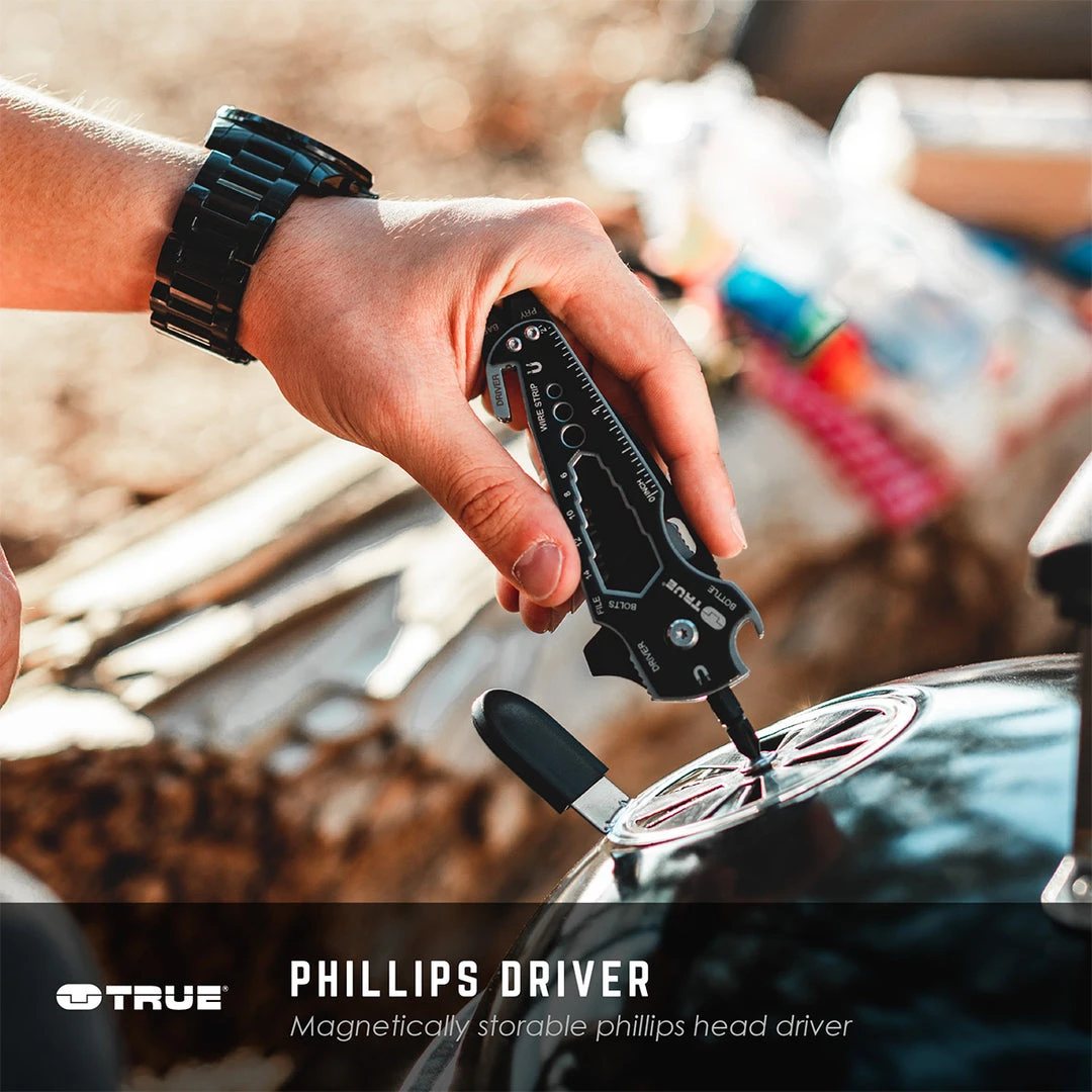 True Utility SmartKnife+ – The SmartKnife+ is a multi-tool wrapped around a super sharp 2.375” black oxidized pocket knife. The multi-tool handle features a small, medium and large flat driver, magnetic ¼” bit driver and holder, file, wire strippers, rulers, wrenches, pry bar, pocket clip and bottle opener, making this the smartest knife you can put in your pocket.