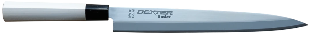 P47010 10 inch Sashimi knife – Dexter Basics Japanese Style Chef’s Knives offer performance and value for home and commercial use, featuring 400 series stain-free, high-carbon steel blades with durable, magnolia wood handle. Blades are hollow ground for easy edge maintenance and rapid re-sharpening. Traditional blade patterns and razor sharp edges blend to create tools to enhance the look and flavor of authentic Japanese cuisine.