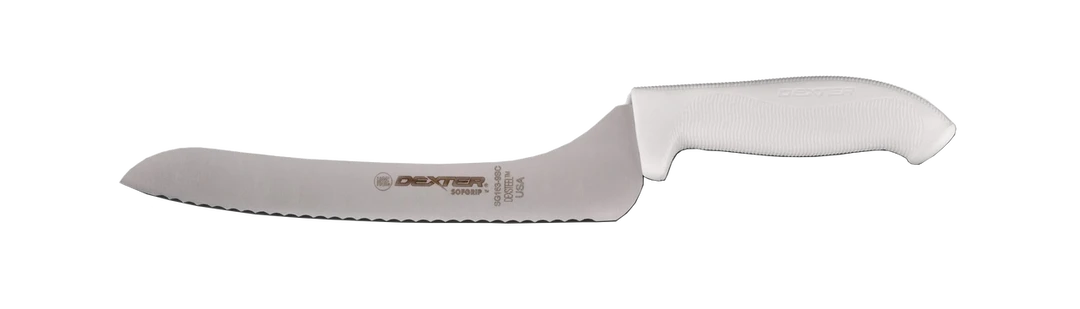 Dexter Russell SG163-9SC 9″ Sofgrip Offset Scalloped Knives keeps your knuckles above the cutting board when cutting up a lot of bait or chum. It’s ultra-sharp scalloped edge goes through frozen or fresh bait with ease. It features our SOFGRIP handle that is soft to the grip and provides great control along with slip resistance. It features our proprietary high carbon, high alloy, stain free DEXSTEEL. This knife is NSF certified and is made in the U.S.A.