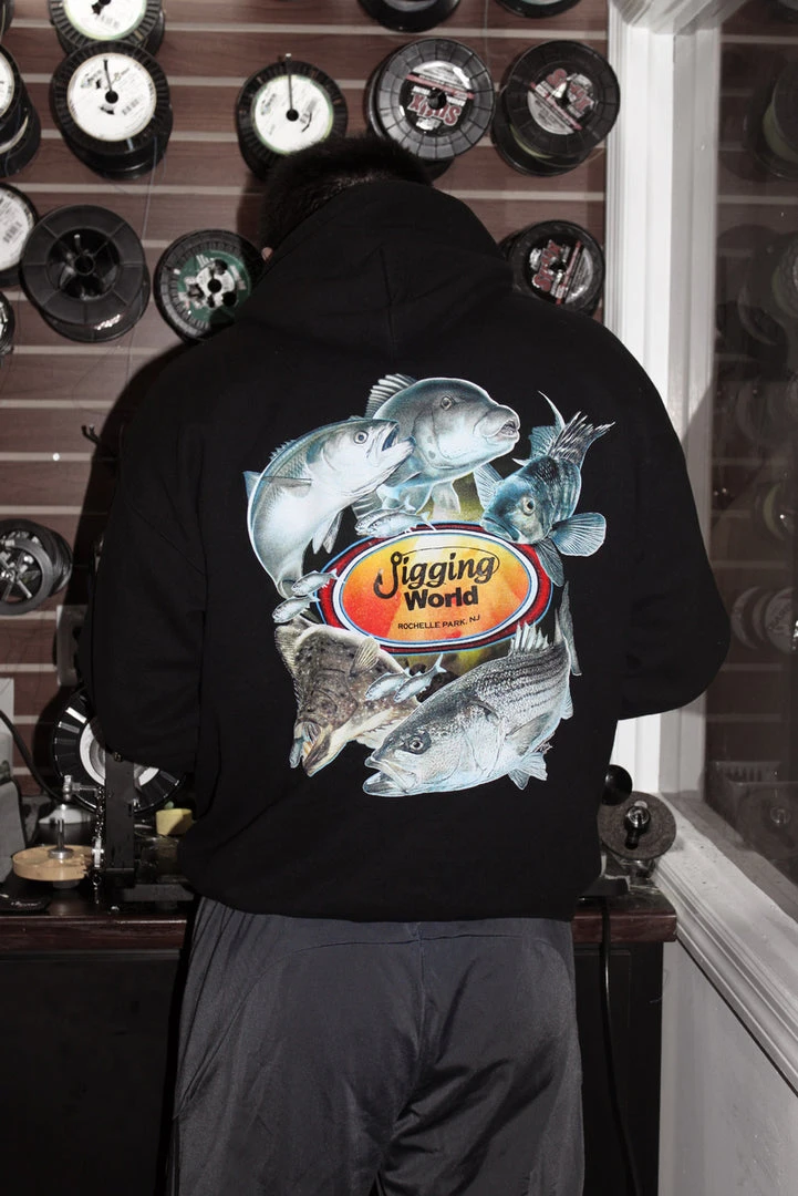 Jigging World Pullover Hoodies – Representing Jersey with Jersey fish–fluke, striped bass, sea bass, blackfish and weakfish.