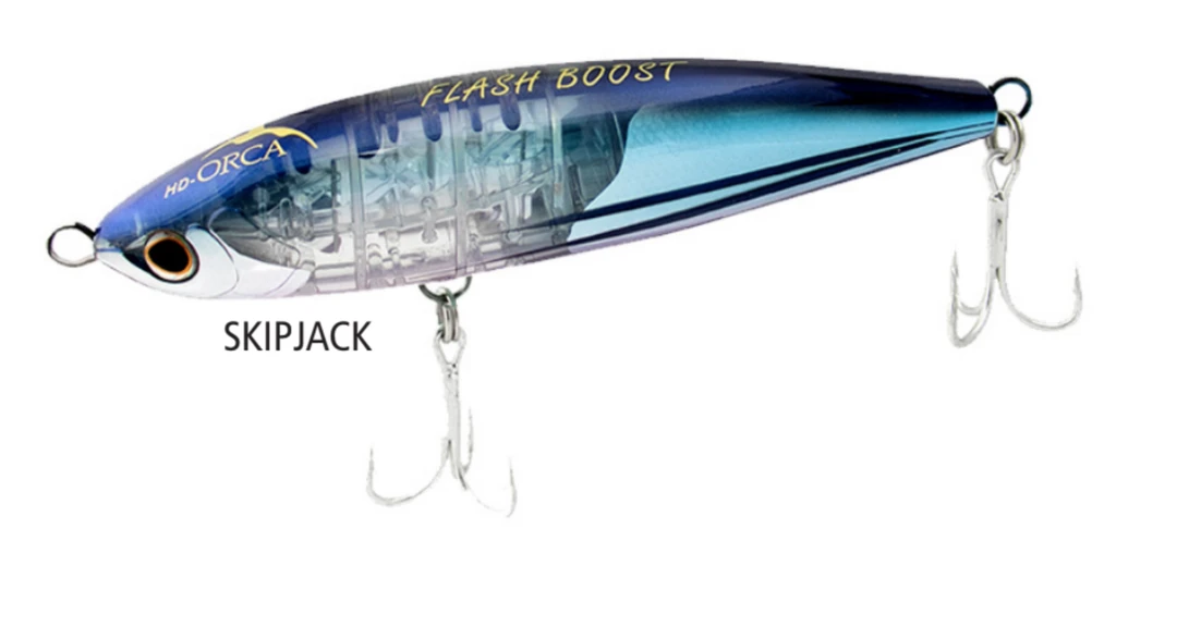 Shimano HD-Orca Flash Boost Lures comes equipped with Shimano’s revolutionary Flash Boost technology. The Flash Boost technology suspends foil on small springs inside of the lure’s body. This allows the lure to constantly emit an attractive flash, even on the pause. The placement and movement of the foil is also designed to mimic the movements of an injured baitfish. This lure comes equipped with 3X hooks and split rings, through wire construction, and Shimano’s Propulsion Weight Transfer system for increased casting distance.