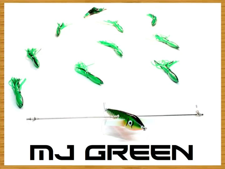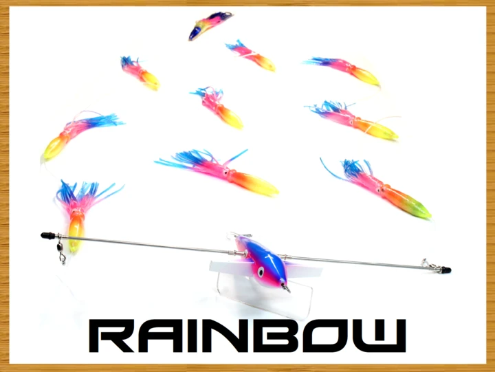 Rigged on our 7″ Looney Bird with 5mm Lexan Directional fin, a 1/8″ 316 SS bar, Nickle Plated Brass swivel Sleeves, 200lb Momoi line, 9 of our 9″ Squids, and our TMK Stinger Bait with our 7691 Stainless Steel 8/0 Hook (attached behind last teaser squid with a 200lb snap swivel).